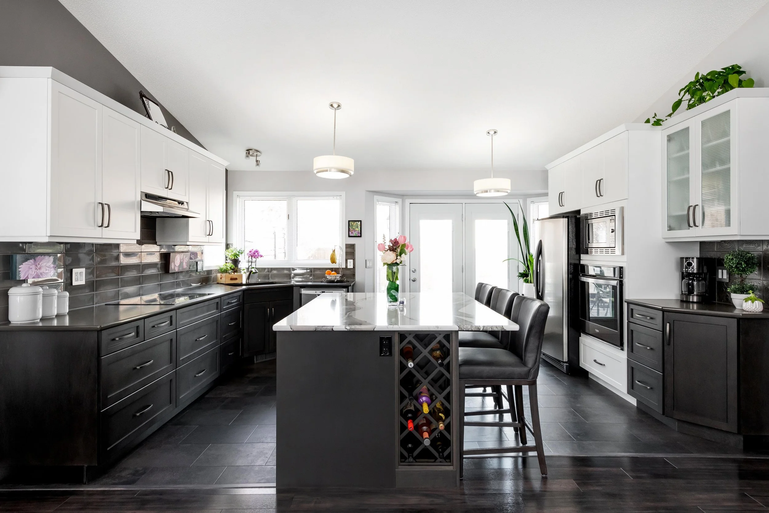 Contrasting colors with clean finishes makes this a modern beauty. The black and white keeps the bold with the bright here. When accenting around dark colors with natural light, white walls and white cabinet uppers there’s no need to be worried about making a space too dark.